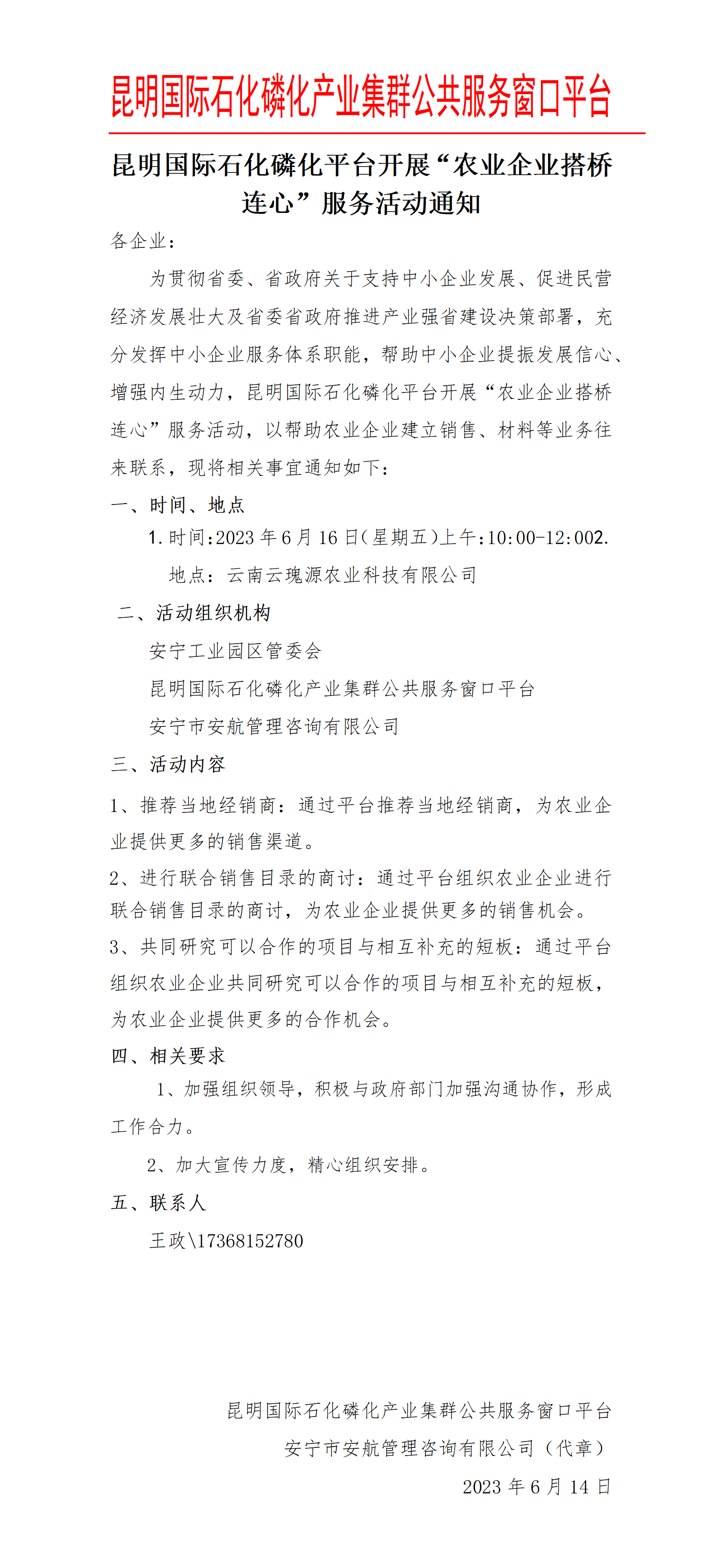 昆明國際石化磷化平臺開展“農(nóng)業(yè)企業(yè)搭橋連心”服務活動通知