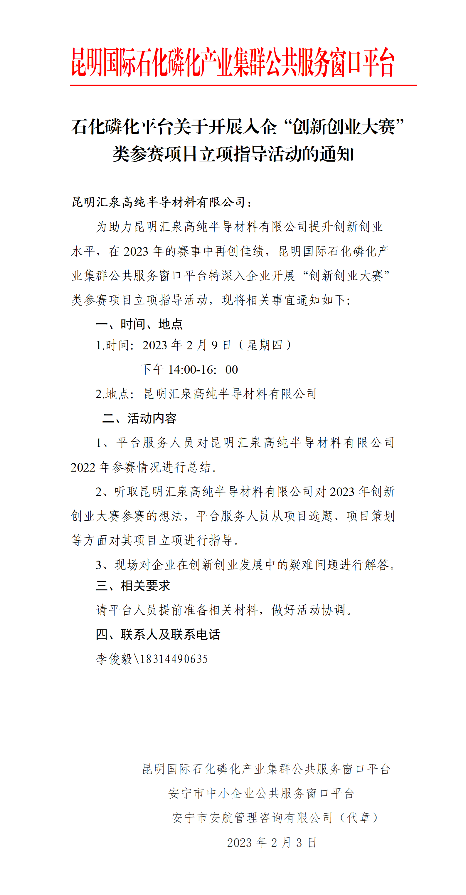 石化磷化平臺(tái)關(guān)于開展入企“創(chuàng)新創(chuàng)業(yè)大賽”類參賽項(xiàng)目立項(xiàng)指導(dǎo)活動(dòng)的通知