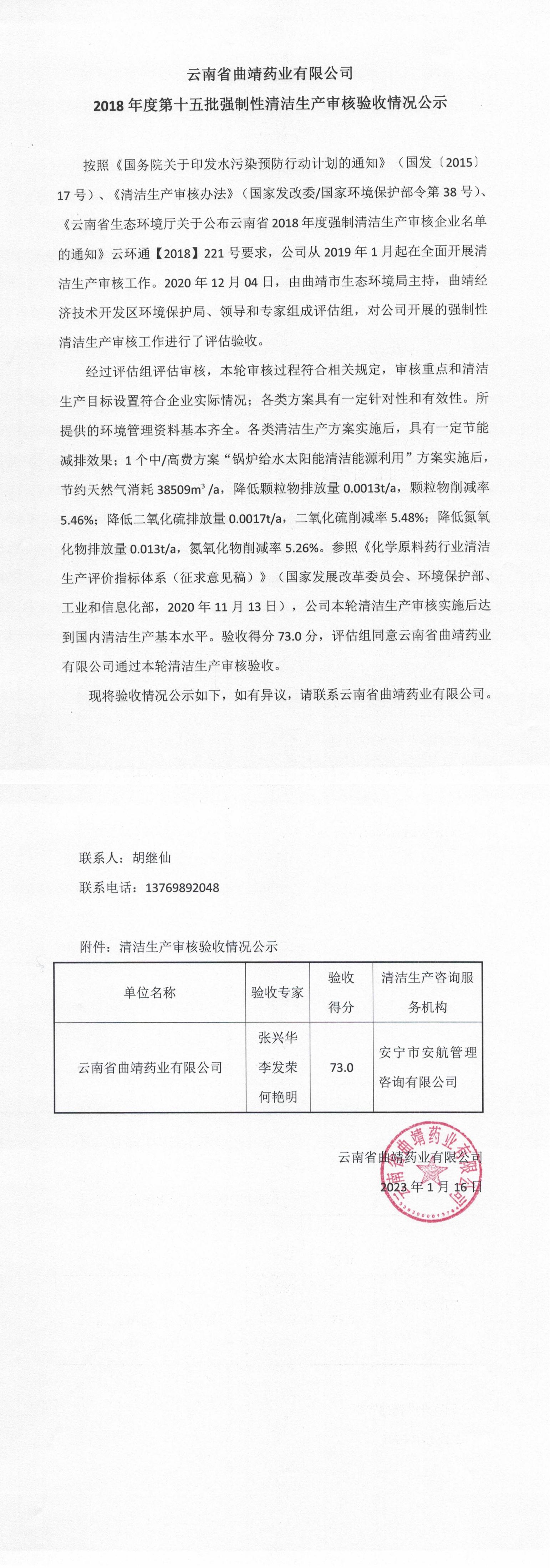 云南省曲靖藥業(yè)有限公司2018年度第十五批強制性清潔生產(chǎn)審核驗收情況公示